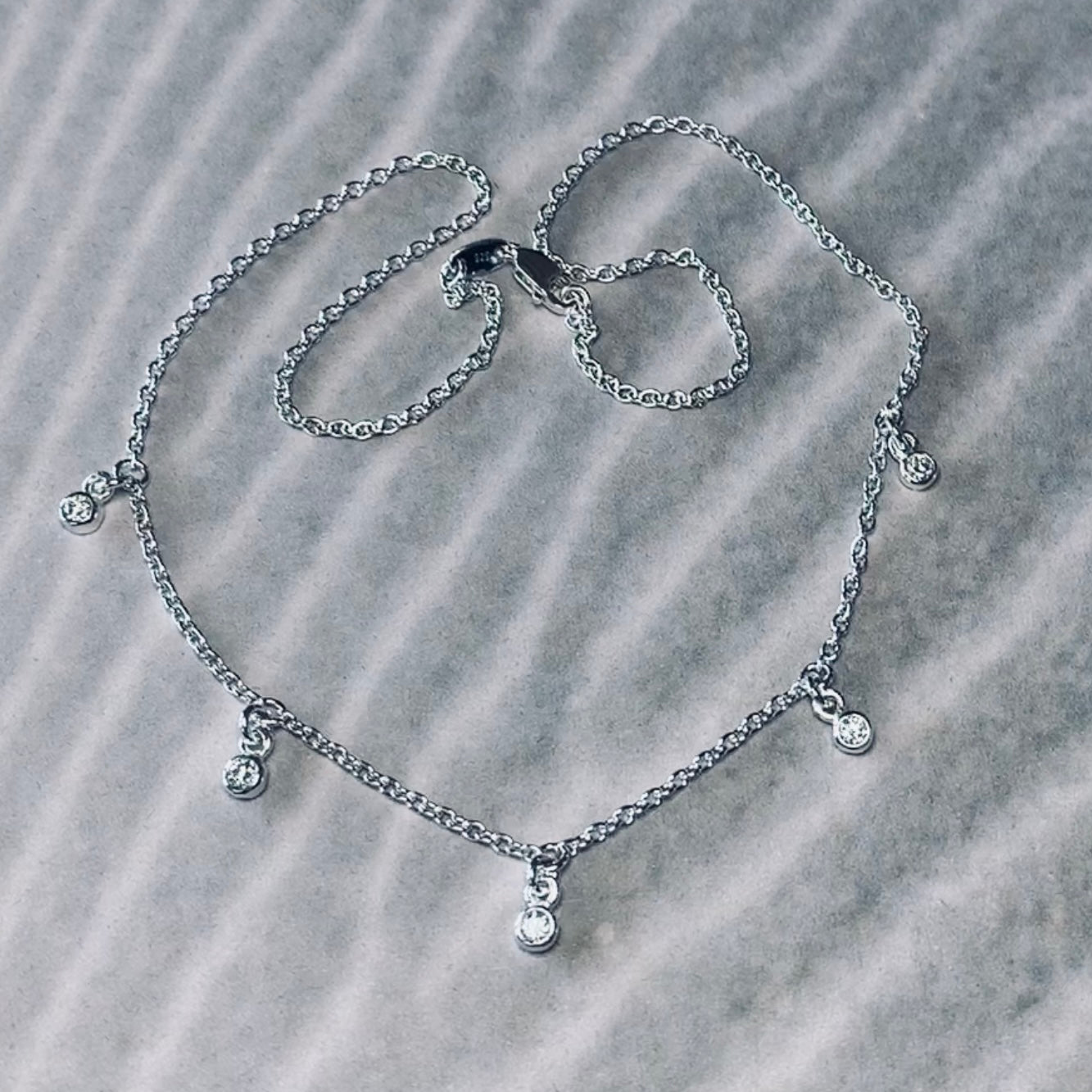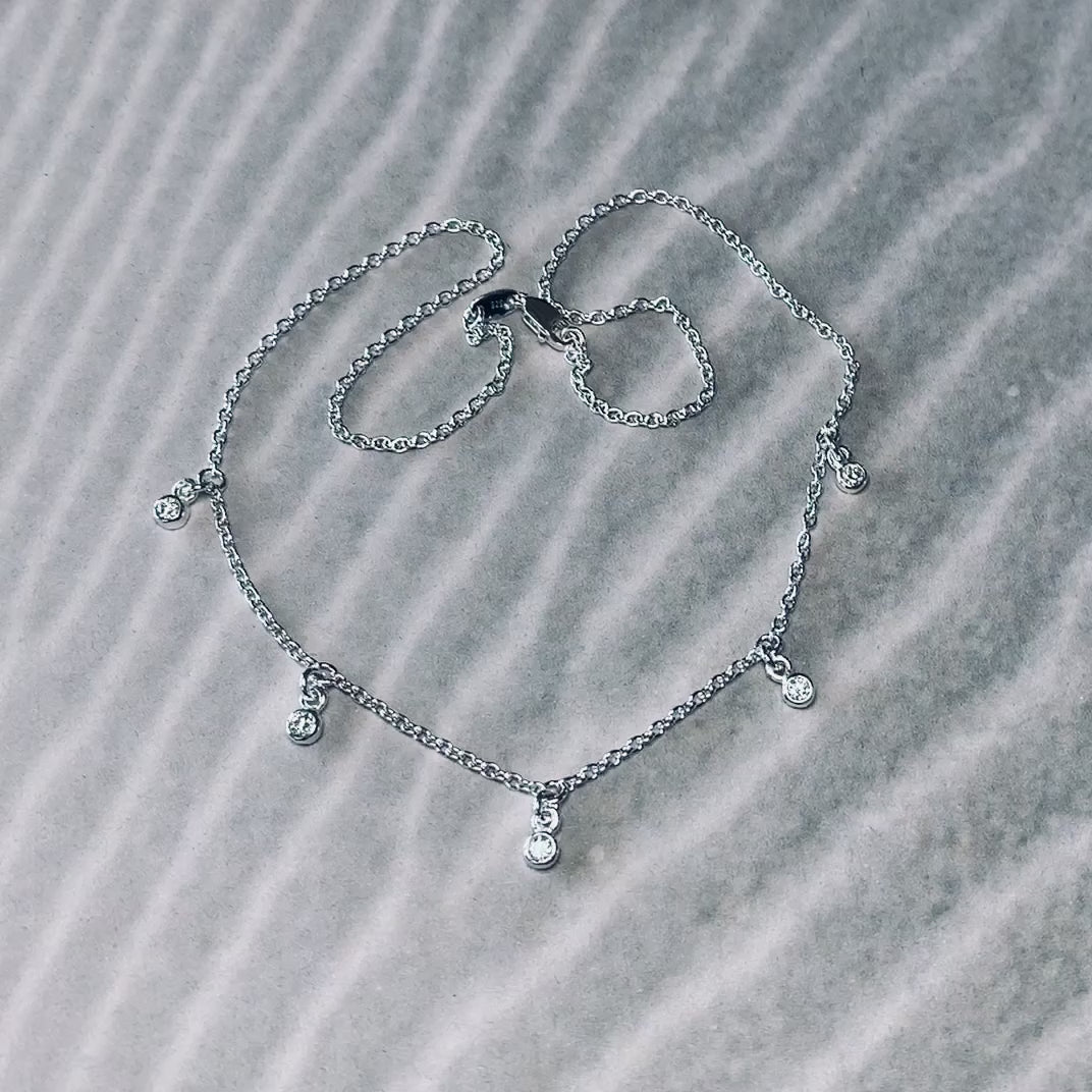Constructed in recycled Sterling Silver. Bezel set Lab Diamonds depending from the Sterling Silver Chain.