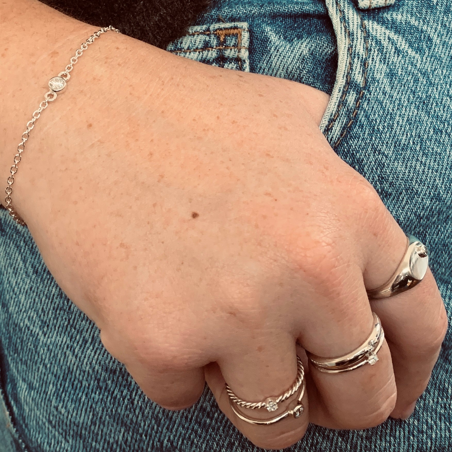 Constructed in recycled Sterling Silver, this 2.5mm Bezel set diamond has a Total Diamond weight: 0.06ct.