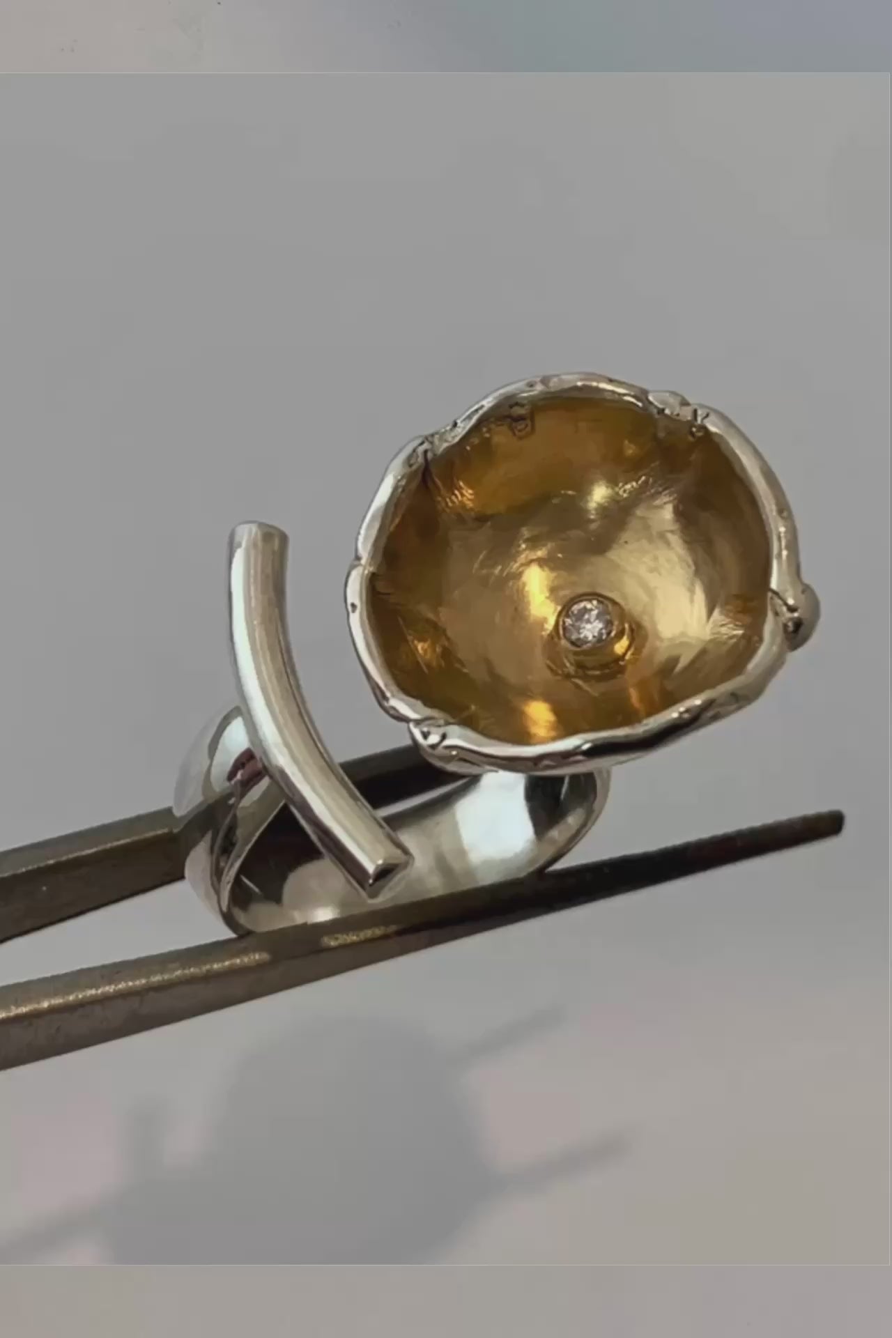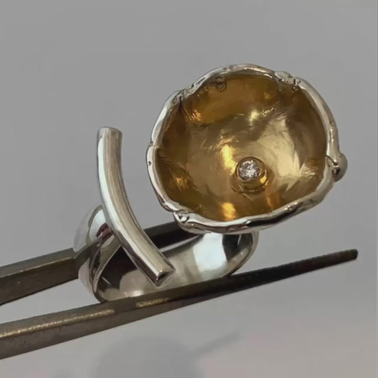 Constructed in recycled Sterling Silver, with a lab Diamond set in the cup of the flower which is enlivened with 18kt Gold Vermeil.